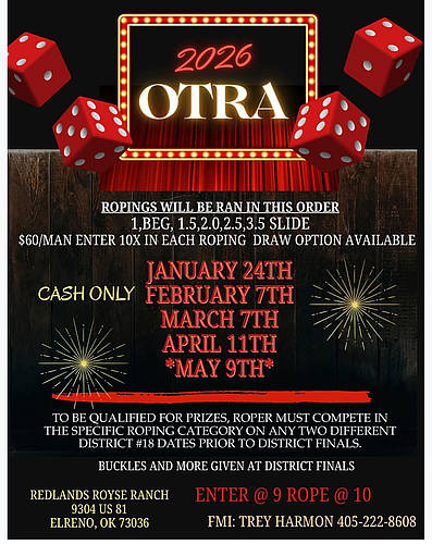 To be qualified for prizes, roper must compete in the specific roping category on any two different District #18 dates prior to District Finals.