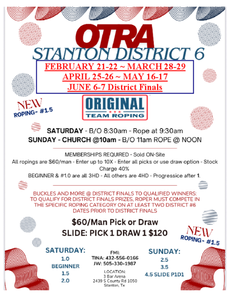 Buckles & more to be awarded at District Finals to qualified ropers. To be qualified for prizes, roper must compete in the specific roping category on any two different District #6 dates prior to District Finals.